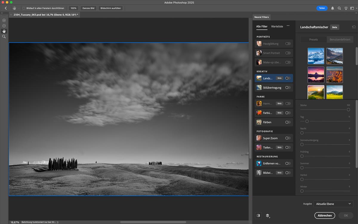 Im zweiten Teil geht es um die Bearbeitung deiner Bilder. Du lernst, wie du mit Lightroom und Capture One den maximalen Dynamikumfang, perfekte Schärfe und beeindruckende Farben aus deinen RAW-Bildern herausholst. Von KI-basierten RAW-Profilen über Masken bis hin zu adaptiven Presets – hier bekommst du wertvolle Werkzeuge an die Hand. Abschließend zeigt dir Frank Werner, wie Photoshop deine Bearbeitung ergänzt und komplexe Aufgaben wie das Entfernen störender Elemente oder die Anwendung neuraler Filter übernimmt.